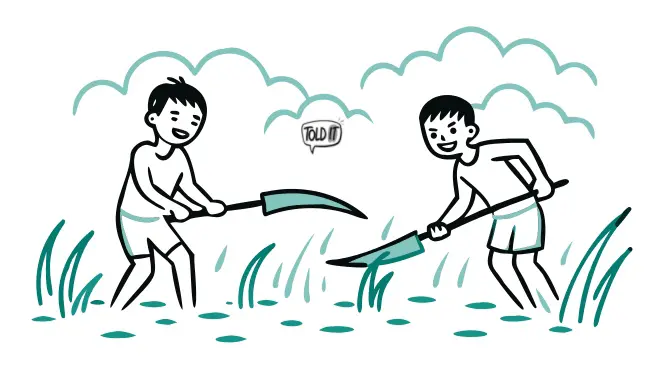 On the way to school that morning, Poran had noticed fresh young grass sprouting along the edges of the paddy fields — perfect for Ramu to eat. But Ramu couldn’t be brought there now; the fields had been sprayed with fertilizer and pesticide. So the brothers had planned: the next time school got dismissed early, they’d cut as much grass as they could for Ramu. That way, he’d have enough for a few days. If they did this every now and then, they could get him through the rainy season.