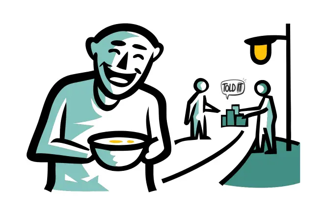 He jingles his bowl. “I won’t spend a single coin. I earn without work.”